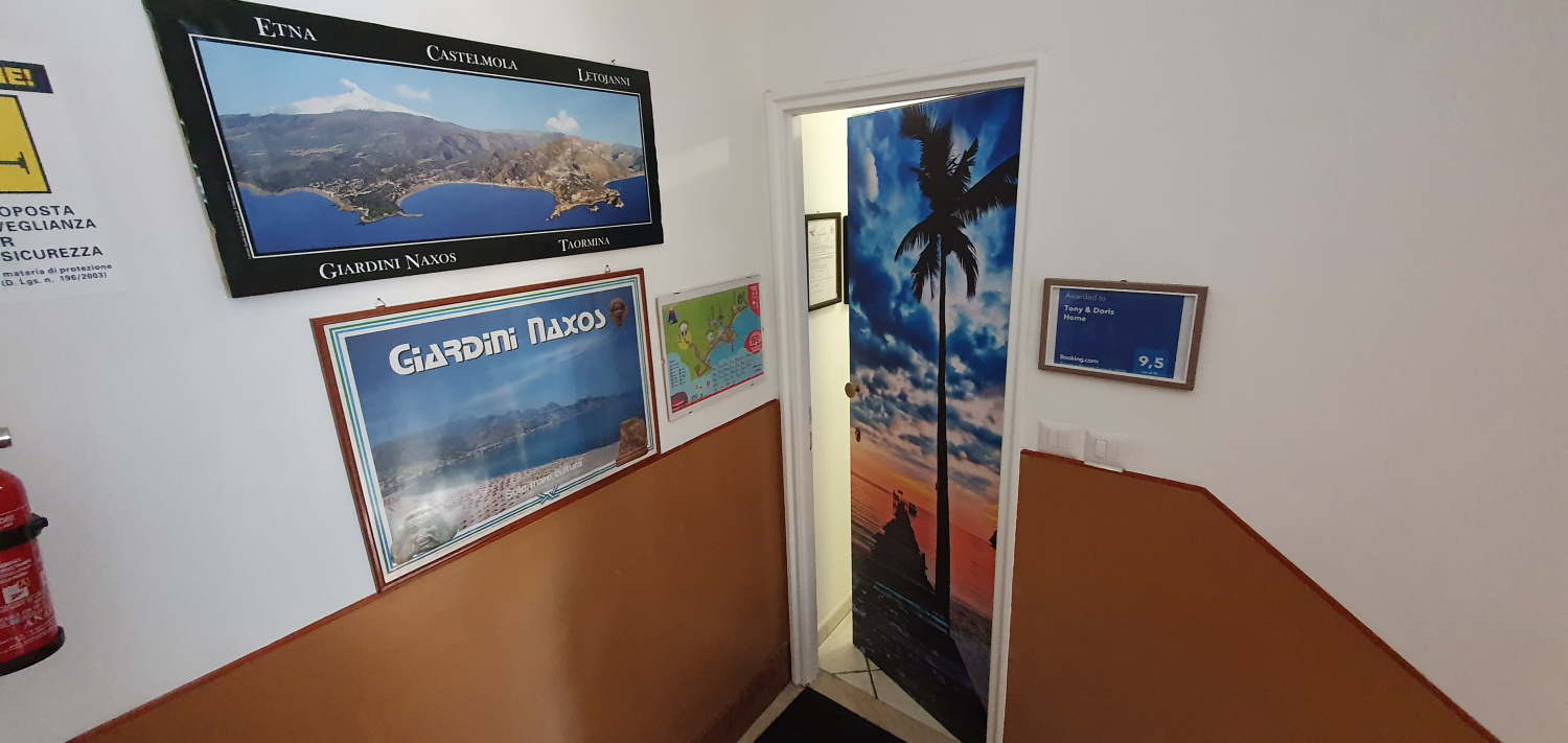 Tony e doris home dispone di 2 appartamenti: uno matrimoniale e l'altro quadruplo. Entrambi sono disposti al terzo piano con vista mare e si trovano a 30 metri dalla splendida spiaggia di sabbia fine nell'incantevole baia di giardini-naxos le camere sono entrambi con bagno privato e cucina attrezzata. La struttura si colloca in una zona centralissima ed è fornita da tutti i migliori servizi infatti non è indispensabile la macchina per spostarsi in quanto tutto si trova nel raggio di 200 metri. La fermata del bus si trova solo a 100 metri per spostarsi in tutte le direzioni. Dalla struttura ci si può muovere a piedi perchè tutto è a portata di mano: banche, posta, ristoranti, bar, spiagge libere e lidi balneari attrezzati, isola pedonale ecc.