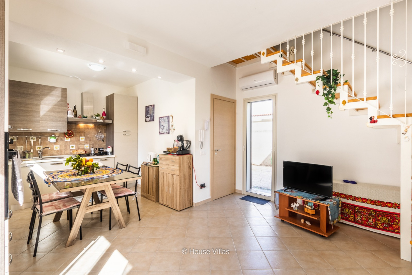 la villa dispone di ingresso indipendente con posto auto interno ed è composta da una camera matrimoniale, una camera doppia, una luminosa cucina/soggiorno, un bagno e una veranda attrezzata con zona pranzo esterna. Il giardino privato, arricchito da una comoda doccia esterna, è perfetto per rilassarsi dopo una giornata di mare.