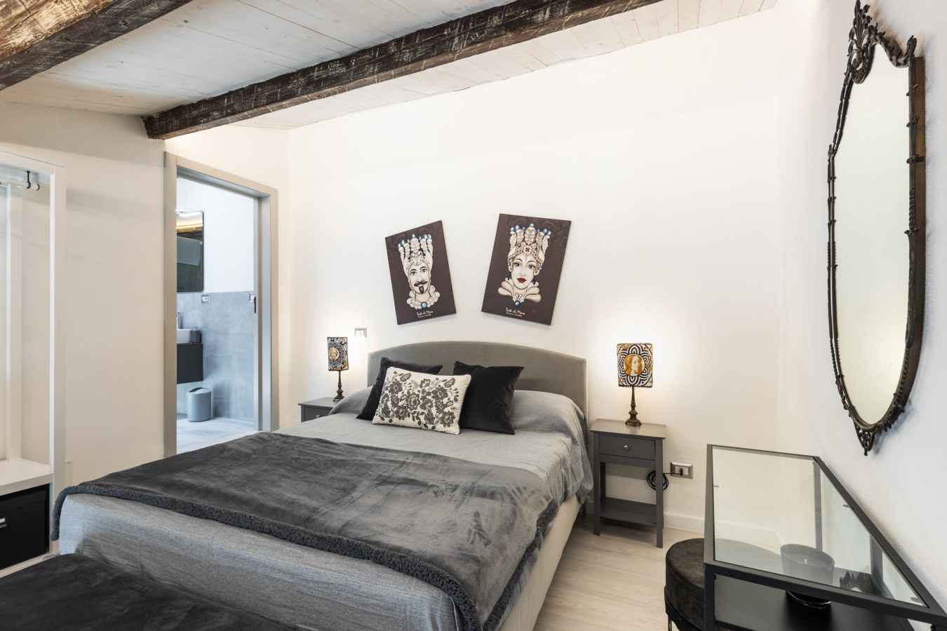 il soppalco luminoso ospita un letto matrimoniale e un bagno aggiuntivo, garantendo privacy e comfort per tutti gli ospiti.