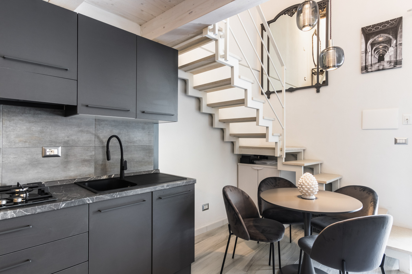 gli interni, dal design moderno ed elegante, offrono ambienti accoglienti e funzionali. Al piano terra si trovano una zona cucina-soggiorno completamente attrezzata, con divano letto, e una camera da letto matrimoniale con bagno privato.